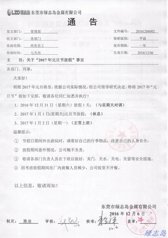 2017元旦放假通知-綠志島-領先綠色科技